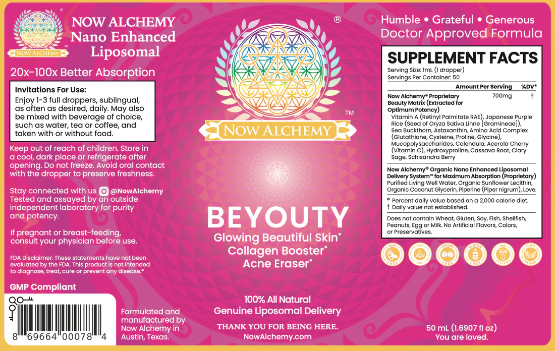 Now Alchemy’s Beauty elixir is a blend of collagen boosting amino acids and herbs, all in a nano enhanced liposomal formula to help the skin get rid of stubborn acne, and support the beautification of your skin and glow.