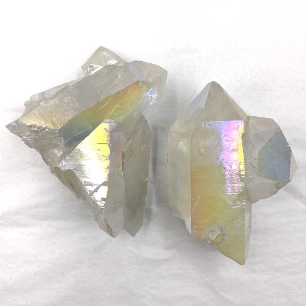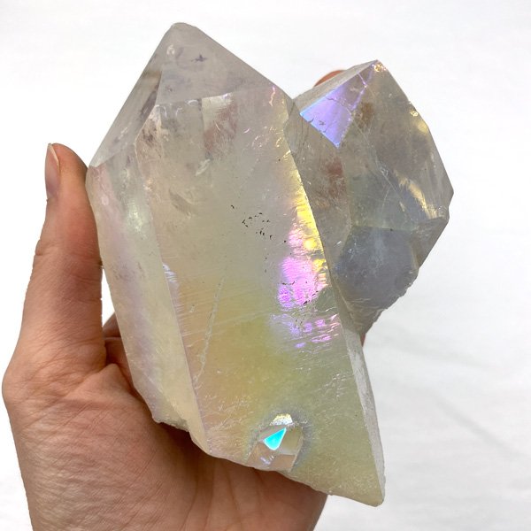 Opal aura quartz, also known as angel aura, is the end result of a process which uses intense heat to infuse platinum and silver to natural quartz. The atoms fuse to the crystal’s surface, which gives it an opalescent metallic sheen on a colourless crystal.