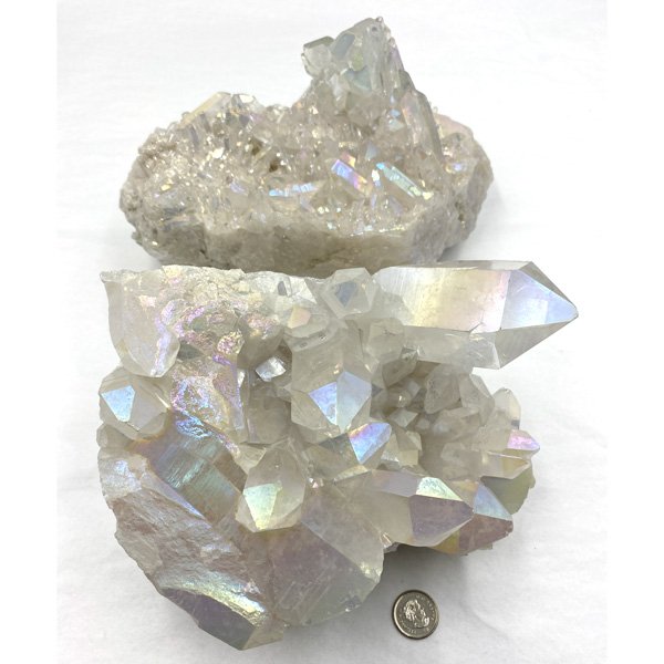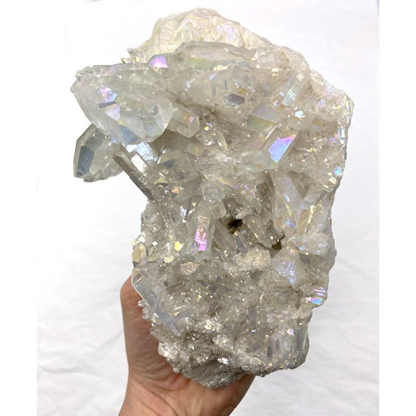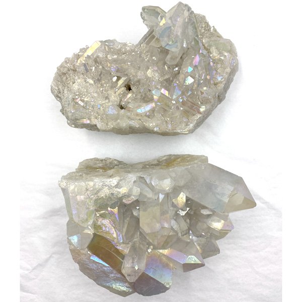 Opal aura quartz, also known as angel aura, is the end result of a process which uses intense heat to infuse platinum and silver to natural quartz. The atoms fuse to the crystal’s surface, which gives it an opalescent metallic sheen on a colourless crystal.
