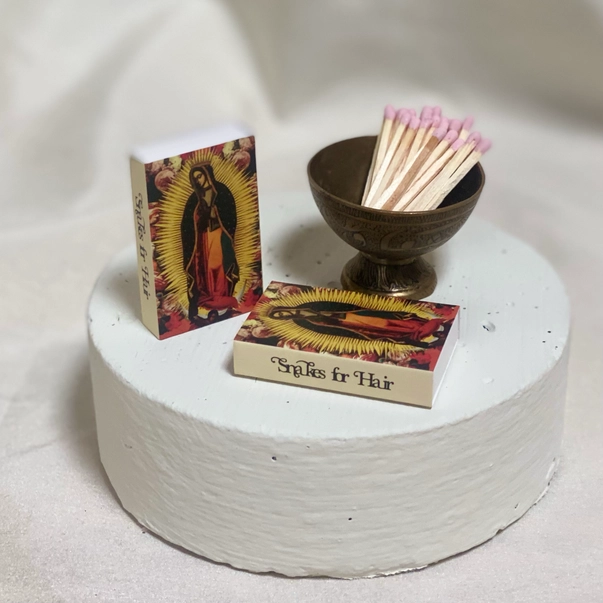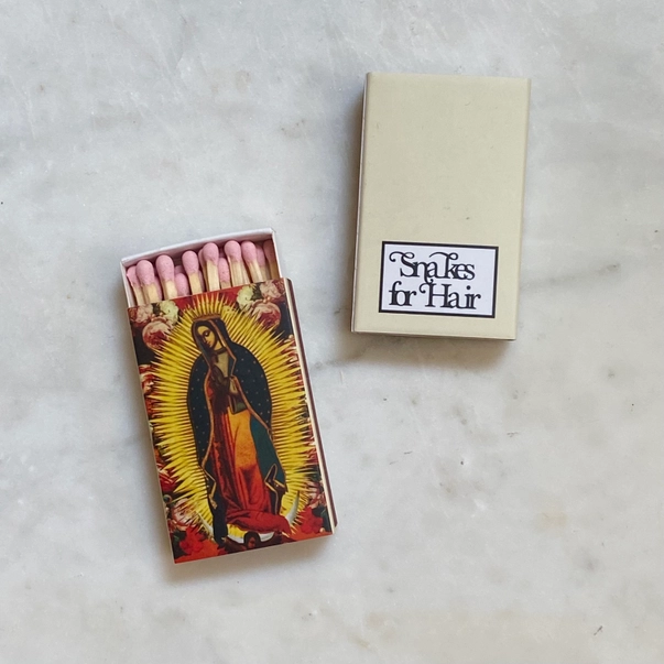 This mini 2.1” x 1.41” x .39″ matchbox features an image of the patron saint of Mexico based on our candle. Contains approximately 25 wooden matches with powder pink tips. Perfect for spell work & as altar accoutrements, party favors, or as art object to adorn your coffee table or nightstand.