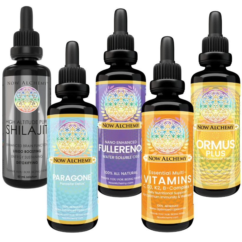 1 bottle of Ormus Plus, 1 bottle of Fullerenol, 1 bottle of Shilajit, 1 bottle of Vitality, and 1 bottle of Detox.