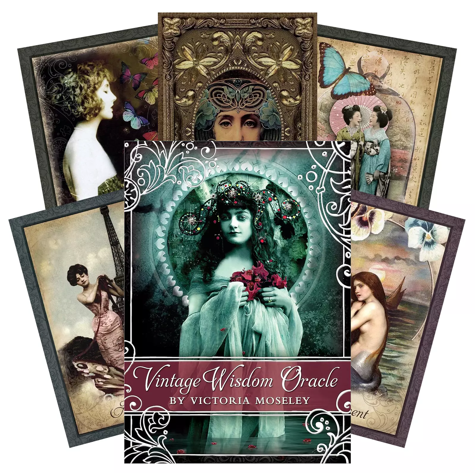 The Vintage Wisdom Oracle set presents 52 lavishly illustrated oracle cards infused with the beauty and inspiration of goddesses, divas and muses from bygone eras. Rich in symbolic detail, these nostalgic montages have been artfully crafted from French vintage postcards and sepia family photographs, embellished with delicate flowers and lace.